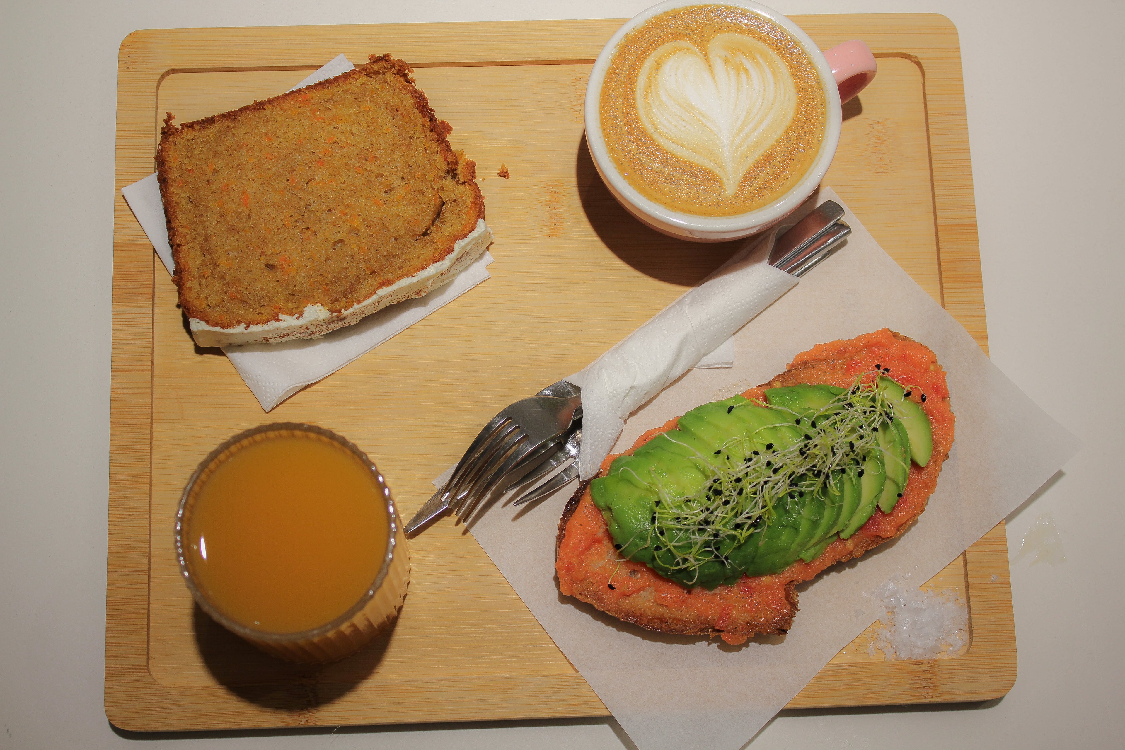 Bowl de yogur, zumo de naranja, café (con leche, solo o cortado), tostada de tomate y aguacate